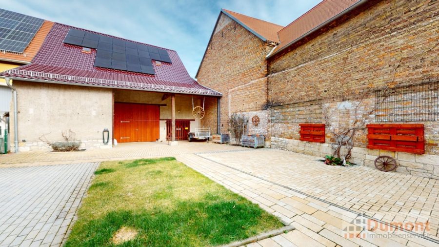 Das ca. 1.468 m² große Grundstück bietet zahlreiche Möglichkeiten zur individuellen Nutzung. Neben dem Wohnhaus befindet sich hier eine große Durchfahrtsgarage, die den vorderen, kleineren Hof mit dem hinteren, großzügigen Hofbereich verbindet – ideal für Fahrzeuge, Hobby oder Gewerbe.