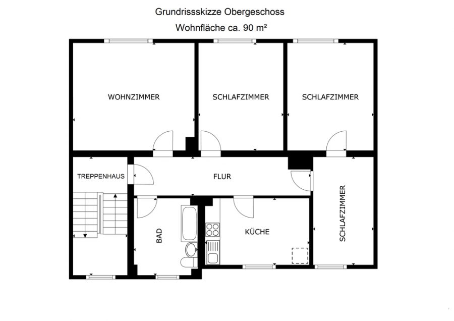 - Obergeschoss, ca. 90 m²: 4 Zimmer, Flur, Küche mit Fenster, Bad mit Fenster